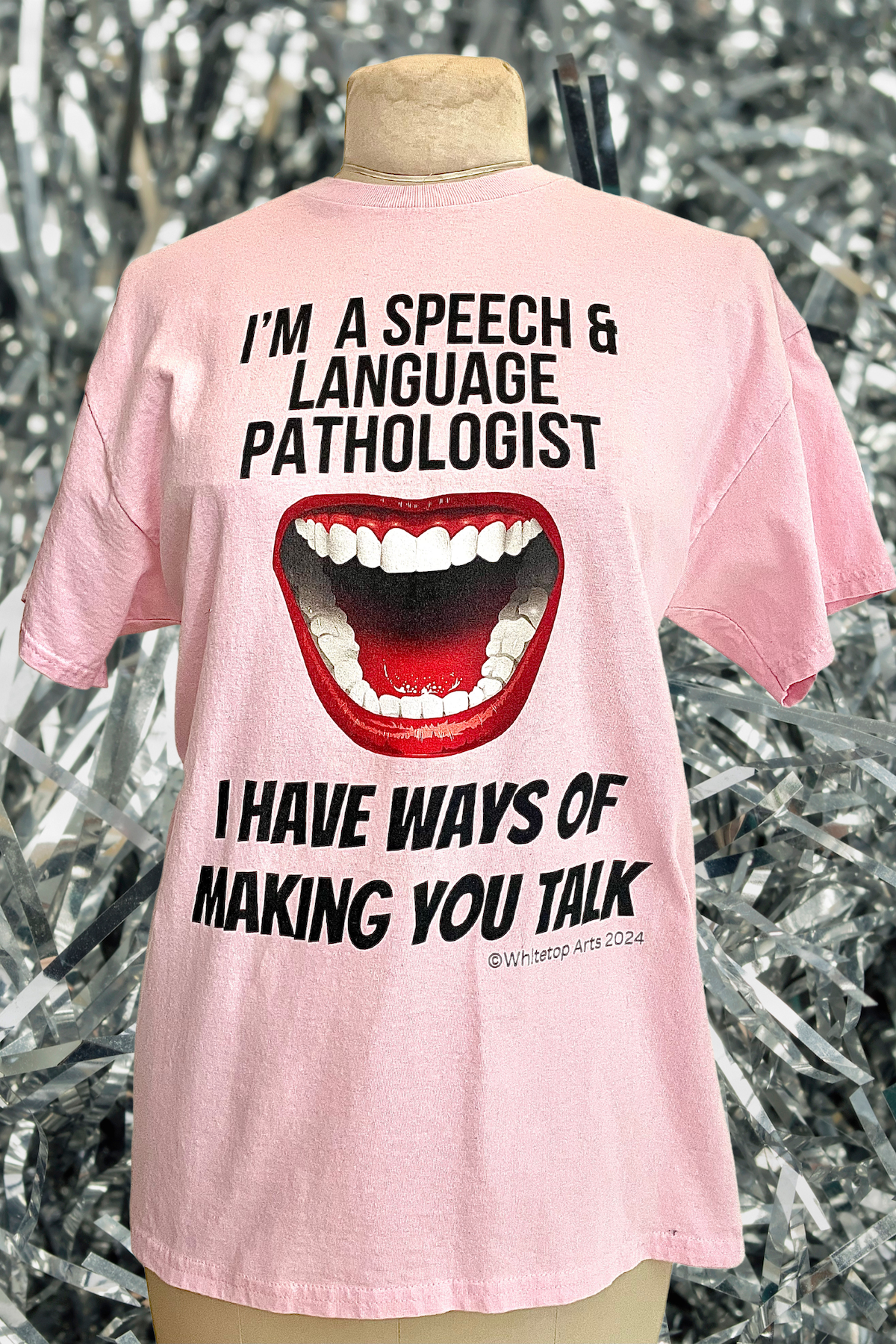 I'm a Speech and Language Pathologist I Have Ways of Making You Talk Short sleeve tee shirt, available in Sport Grey, Kiwi, and Light Pink. Shirt is a Gildan 5000 made of a comfy medium-heavy cotton. Economy shipping available! Whitetop Arts is a small studio nestled in the Blue Ridge Mountains. Shop small!
